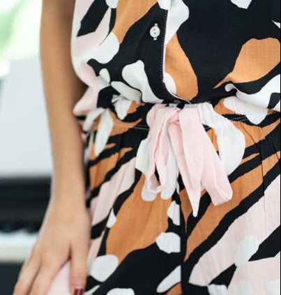Moderno pijama corto de mujer confeccionado en una suave y ligeramente elástica. Presenta un llamativo estampado en tonos negro, blanco y anaranjado, con una camisa de manga y pantalón corto con un lazo en la cintura. Ideal para un descanso con estilo y confort.