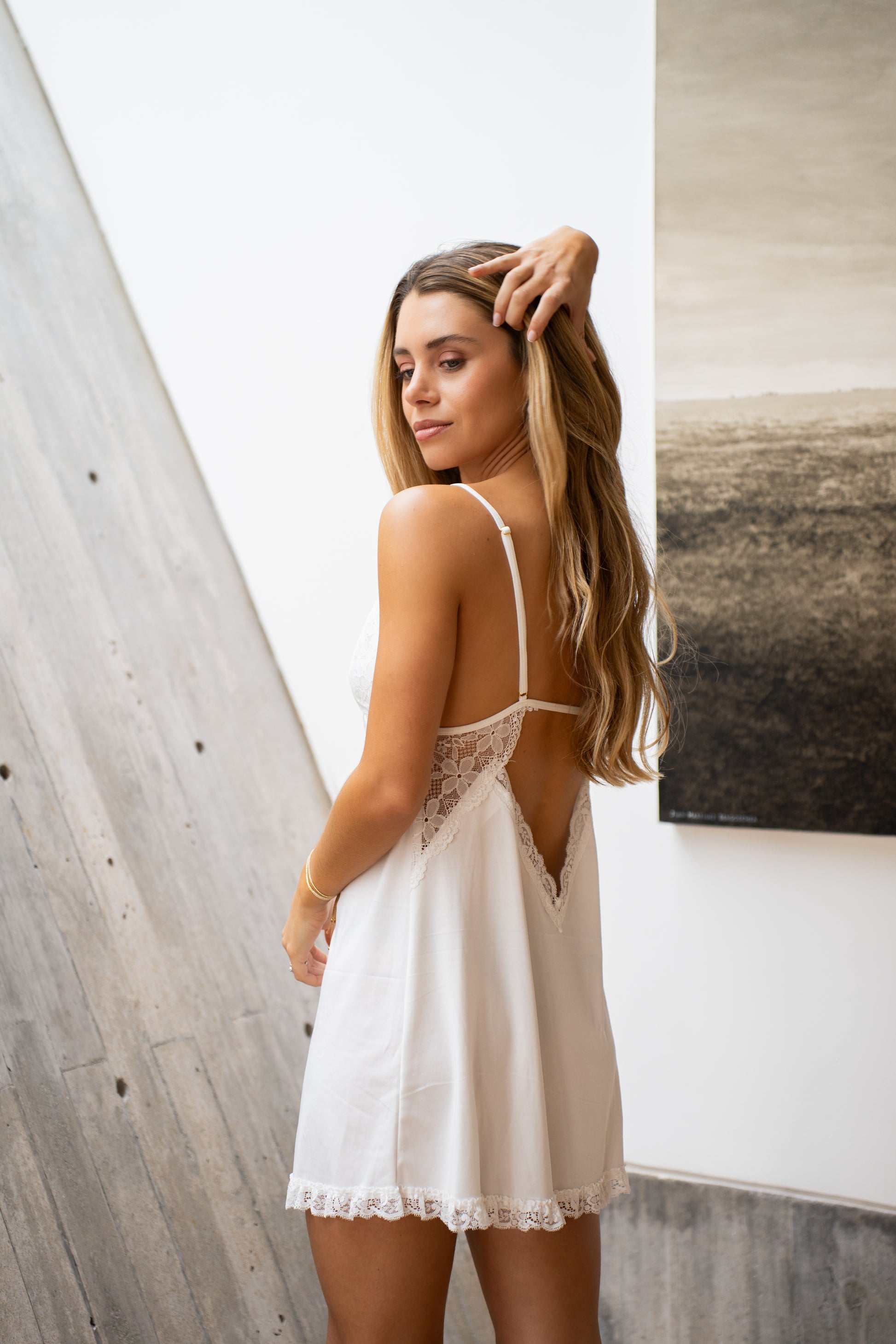Delicada camisola corta de tirantes ajustables en color blanco. Presenta detalles de encaje en el escote, espalda baja y con detalle precioso. Ideal para noches de descanso suaves y femeninas.