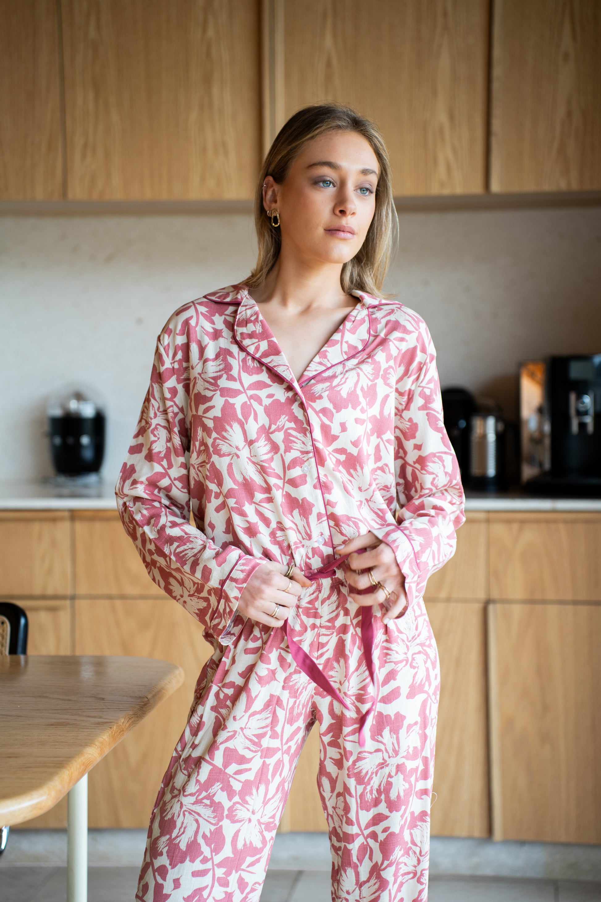 Sumérgete en un jardín de ensueño con nuestro pijama camisero de la nueva colección. Confeccionado en un tejido suave y transpirable, esta prenda está diseñada para envolverte en una sensación de frescura y delicadeza cada noche.