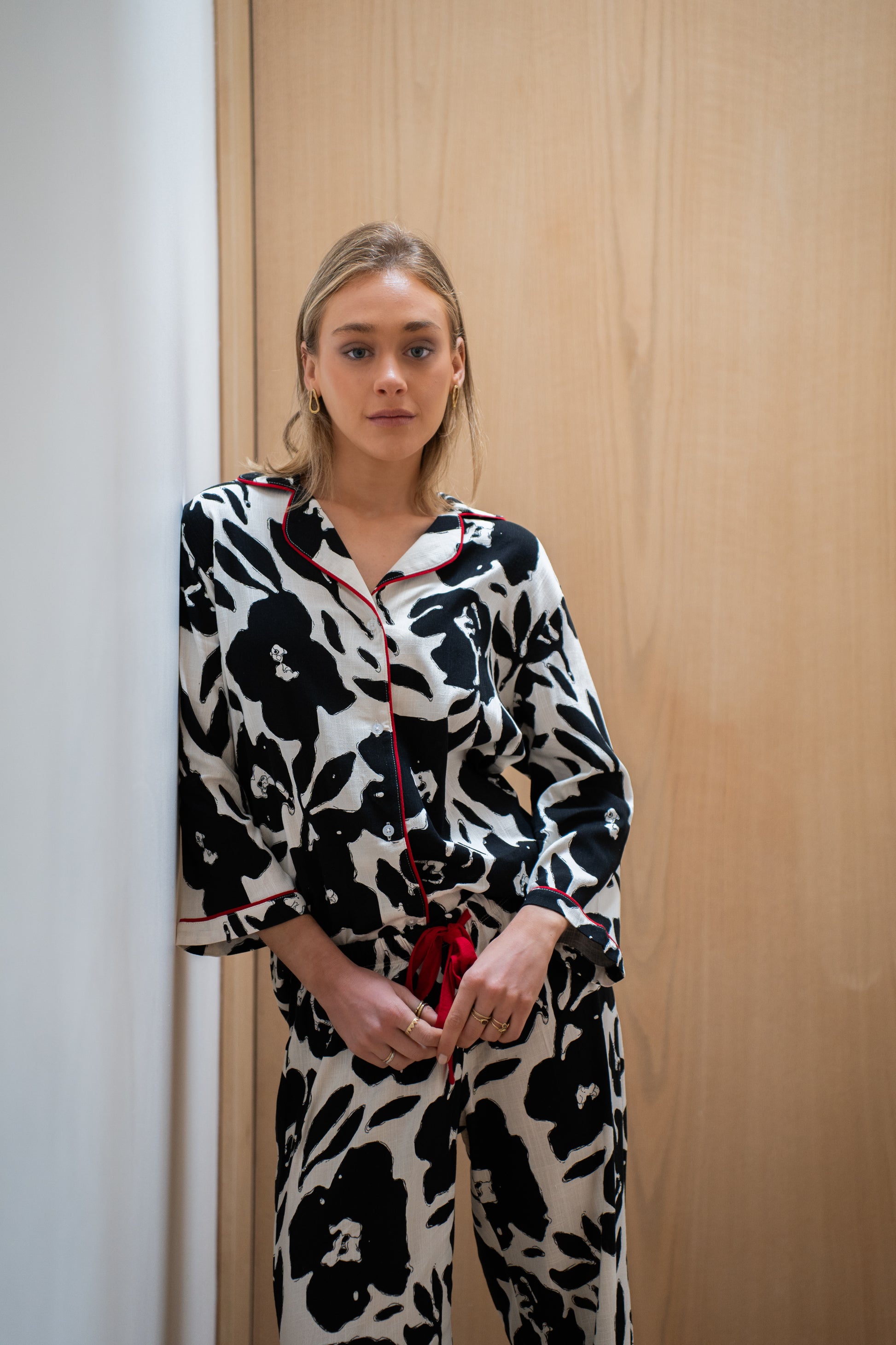 Elegante estampado floral en blanco y negro, un diseño moderno y lleno de personalidad que no pasa desapercibido. Este patrón se realza a la perfección con el llamativo ribete y la cinta de ajuste en color rojo, un toque de color vibrante que añade un aire de sofisticación y hace que el conjunto sea inolvidable.