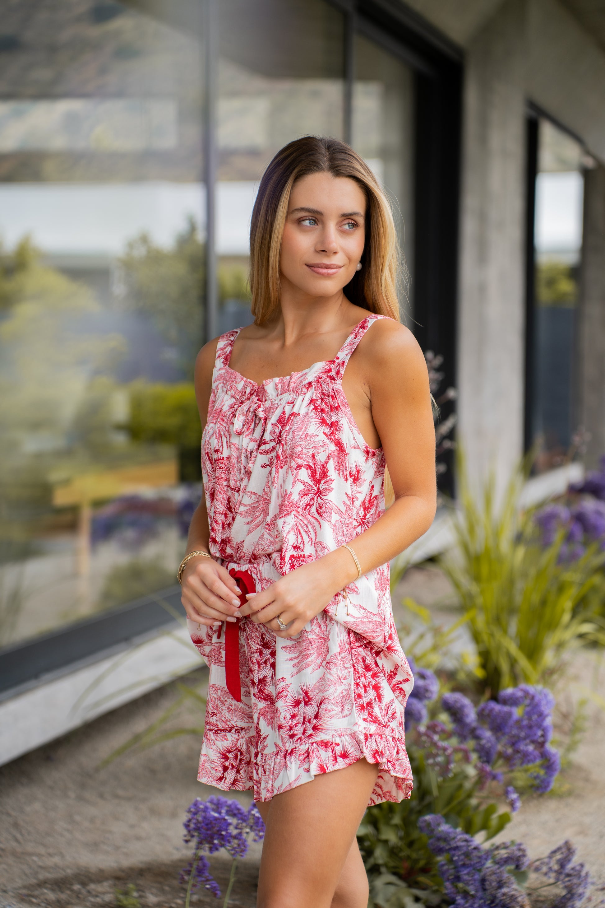 El protagonista es su vibrante estampado floral en tonos fucsia y rosa, un diseño moderno y alegre que irradia vitalidad. Este patrón se combina a la perfección con la silueta coqueta de una blusa con tirantes delicados y un short con vuelos, que le dan un toque juguetón y femenino.